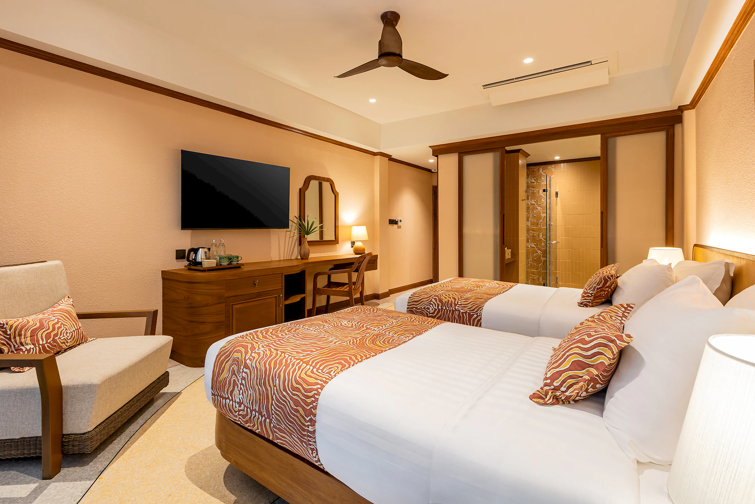 Our Deluxe Junior Rooms embody the Heartwood concept—growing in layers like the spirit of nature itself. Spanning 42 sqm, these eco-friendly sanctuaries offer warmth and comfort for guests seeking relaxation in Krabi. The modern design features a private balcony overlooking peaceful garden views, while sustainable amenities, energy-efficient lighting, and air conditioning create a soothing, mindful stay in harmony with nature.